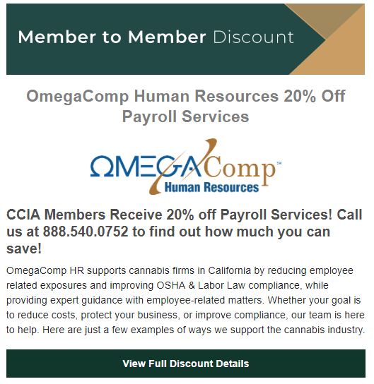 Additionally, your company can submit a Member to Member Discount through the Info Hub! The discount will be featured in our rotating highlighted member discounts in the CCIA Newsletter. Posting a member to member discount is a great way to increase your company's visibility to other CCIA members and the cannabis industry at large.